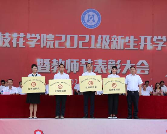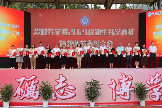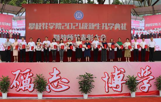 典礼上,马克思主义学院院长、全国优秀教师、全国思想政治理论课优秀老师、四川省首届教书育人名师朱云生教授,钒钛学院教授、硕士生导师田从学博士,体育部主任杨领航副教授,外国语学院辅导员、曾荣获市“优秀班主任”、寻找央视《朗读者》节目“十强选手”等荣誉称号的何旋老师,学生公寓管理员、曾荣获省“学生公寓管理与服务先进个人”、十大“最美公寓人”等荣誉称号的刘小红老师组成教师代表团队,分别从“德、智、体、美、劳”五个方面寄语新生要明大德、守公德、严私德,胸怀大志、知行合一,强身健体、健全人格,发现美、追求美,崇尚劳动、热爱劳动,以“自律”为引领,不负青春、不负韶华,五育并举,做有理想、有本领、有担当的新时代大学生!