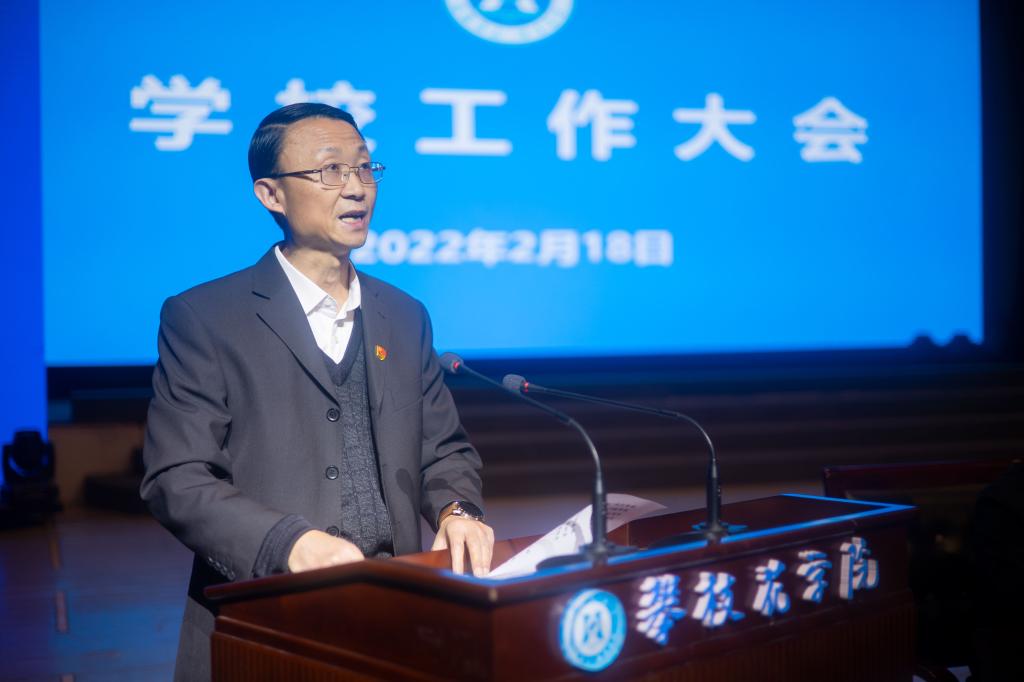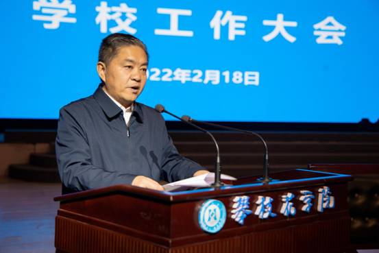 副校长刘立新就持续完善“过程一流”教学体系、深度融合思政教育与专业建设、深化改革实践教学、纵深推进产教融合、全面提升经费使用质效和财务信息化建设、科学规范资产和招投标管理等方面工作进行了安排部署。