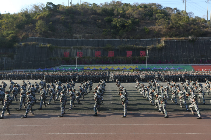 伴随着分列式进行曲,各受阅方队迈着整齐统一的步伐,喊着高亢响亮的口号依次走过主席台接受检阅。