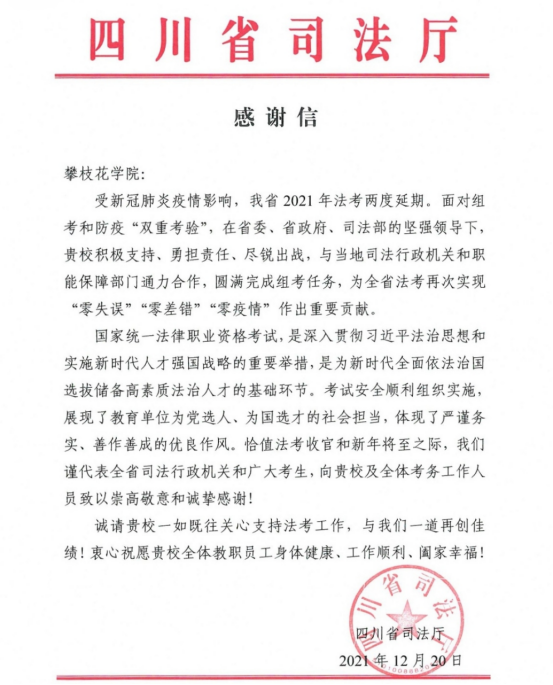 近日,我校收到一封来自四川省司法厅的感谢信。信中高度赞扬了我校在2021年国家统一法律职业资格考试组织实施过程中所做的工作。