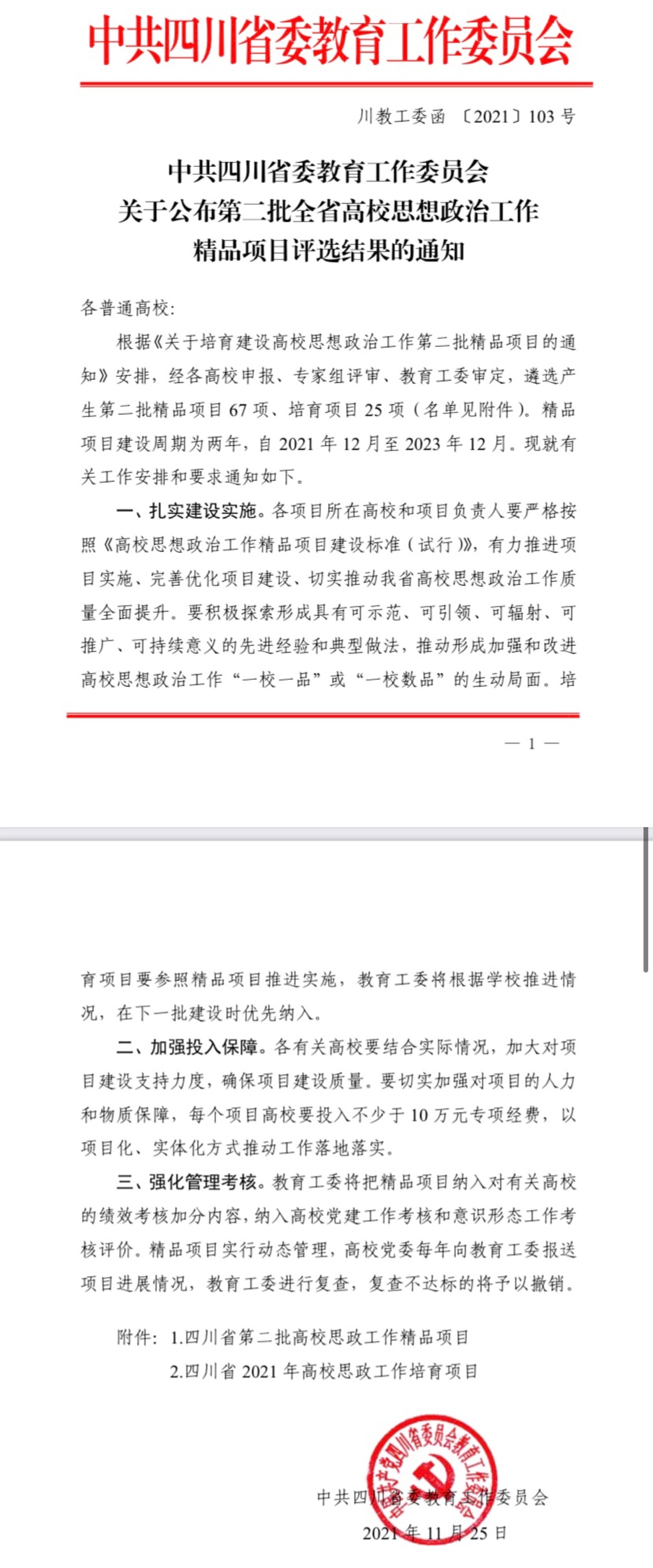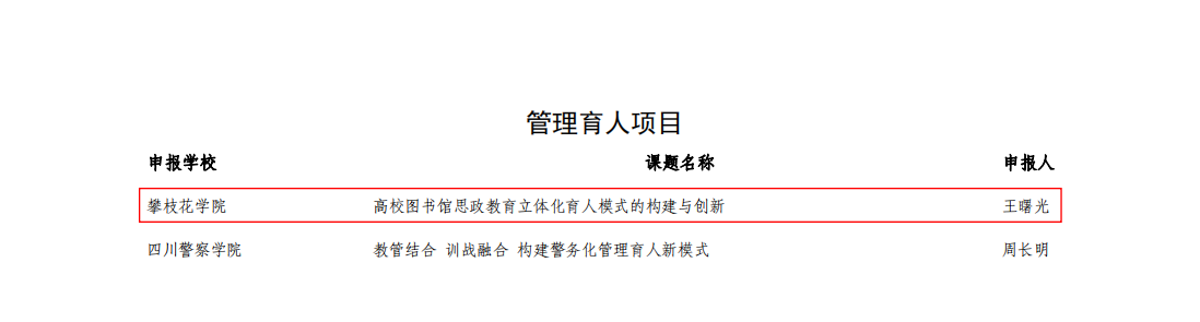 近日,中共四川省委教育工作委员会下发《关于培养建设高校思想政治工作第二批精品项目的通知》,我校党委副书记、校长王曙光牵头申报的《高校图书馆思政教育立体化育人模式的构建与创新》获批管理育人项目立项,马克思学院党支部书记唐林牵头申报的《廉学·联动·共生——大学生廉洁文化课程建设的创新与实践》获批课程育人项目立项。