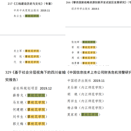 近期,我校以独立完成单位身份获四川省第十九次社会科学优秀成果奖三等奖3项,分别是《三线建设历史与文化》(完成人:朱云生、肖立军、何悦、代俊)、《攀西国家战略资源创新开发试验区发展研究》(完成人:张旭辉、胥刚、李博、周斌、杨勇攀)、《基于社会分层视角下的四川省城市社区治理研究》(完成人:薛荐戈、马东艳、何建朝、刘书生、郭文梅)。另与内江师范学院合作《中国信息技术上市公司财务危机预警研究》(我校完成人:莫家莉)获三等奖