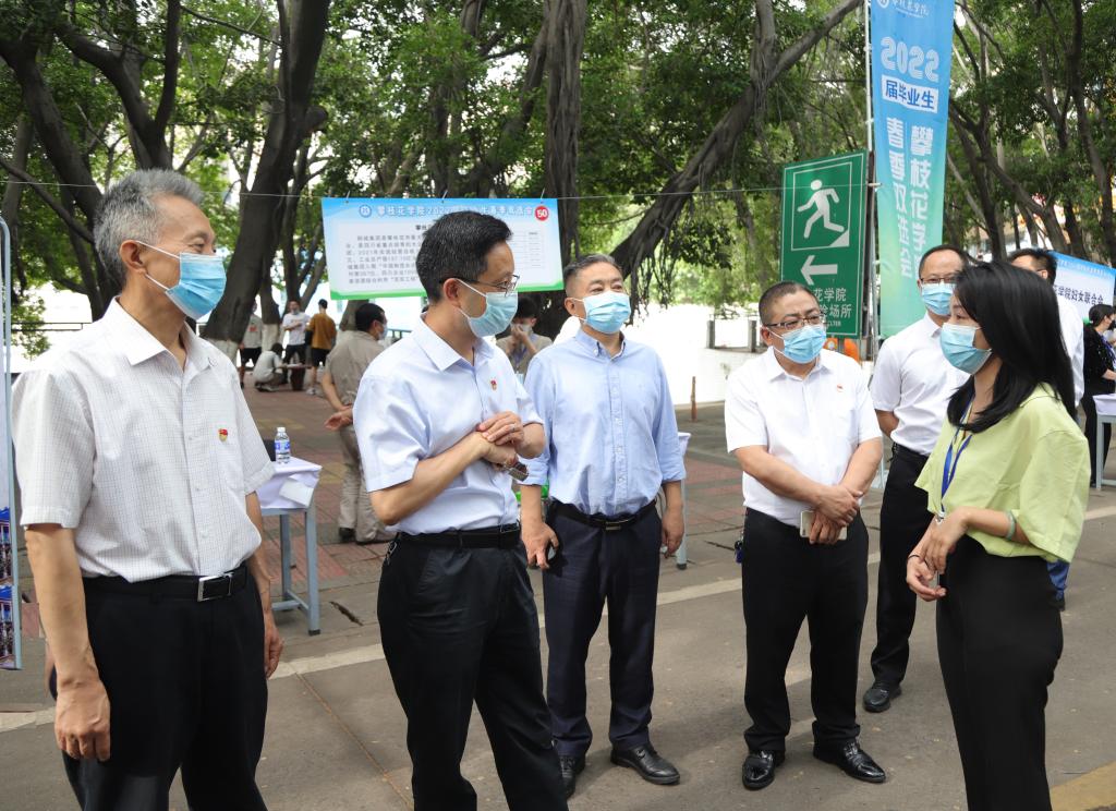 校党委书记王斌,校党委副书记、校长王曙光,副校长王兵,市人力资源社会保障局党委委员、市纪委监委驻市人社局纪检监察组组长杨芯、攀枝花就业创业促进中心和攀枝花市人才服务中心相关负责人亲临双选会现场,认真了解企业发展现状、招聘需求及对学校人才培养工作的意见建议,并就相关招聘情况、人才需求、职业发展等方面进行深入交流。