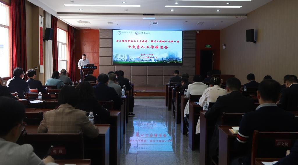 王斌讲话指出,十大育人工作体系是学校以“自律攀大人”文化品牌落实立德树人根本任务的协同工作机制,要勤于“克懒惰”,主动思考、积极作为;要勇于“啃骨头”,敢于直面工作中的困难,加强“斗硬”的力度;要注重“看细节”,立足岗位,落细落小,在细节中强化育人成效;要协同“重整合”,对内整合资源,对外加强联系,汇聚各方力量,推进协同育人;要学会“拓资源”,以40年校庆为契机,拓展社会各界,特别是校友资源,助力学校不断提升工作实效;要善于“深挖掘”,不断拓展学生第二课堂活动,潜心总结经验做法、深入挖掘典型案例,为学生成长成才搭建平台;要实现“更聚焦”,既要聚焦中心任务,更要聚焦主责主业,将工作的目标落脚到育人成效上,努力让更多学生受益,以育人工作“过程一流”,实现人才培养综合素质“增量一流”。