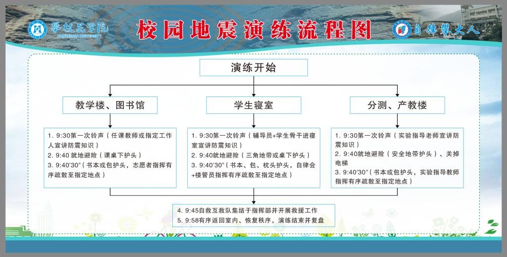 30秒后,模拟第一次地震波结束,在授课教师、志愿者和公寓管理员等指引下,学生们迅速从教室、寝室、图书馆、实验楼等地有序疏散。