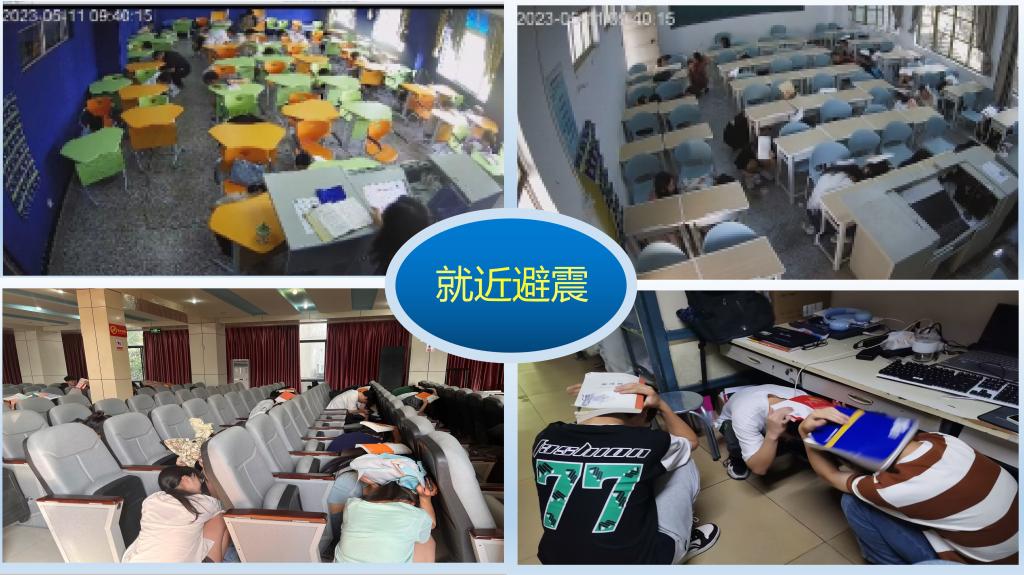 9点40分,通过铃声模拟第一次地震波到达,同学们在老师同一指挥下,就地科学避险。