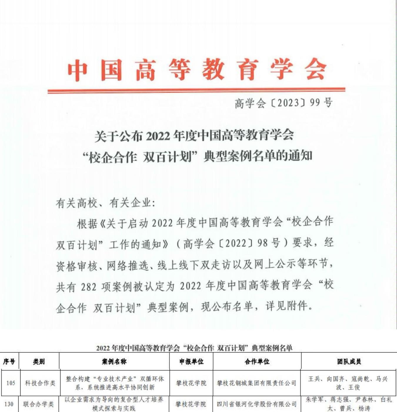近日,中国高等教育学会公布了2022年度中国高等教育博览会“校企合作 双百计划”典型案例认定名单,我校“整合构建‘专业技术产业’双循环体系系统推进高水平协同创新”“以企业需求为导向的复合型人才培养模式探索与实践”两个案例成功入选,至此,我校已累计4项被成功认定为“校企合作 双百计划”典型案例。