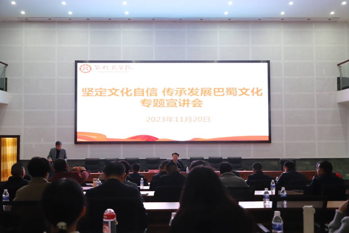 为认真学习贯彻习近平文化思想,深入学习领会习近平总书记在文化传承发展座谈会上的重要讲话精神,坚定文化自信,增强文化自觉,更好担负新时代新的文化使命,11月20日,西华大学文学与新闻传播学院院长潘殊闲教授应邀来校作《坚定文化自信传承巴蜀文化建设文化强省和文化强市》专题辅导报告。党委书记胥刚、机关教辅单位负责人、直属党组织书记、师生代表等共130多人参会。党委副书记刘立新主持会议并总结讲话。