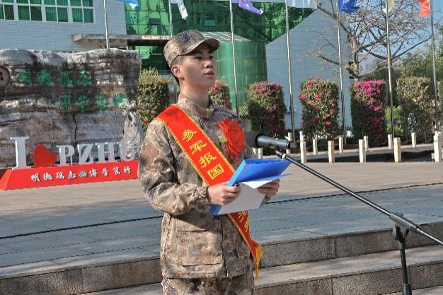 参军入伍大学生代表李凯强表达了对未来军旅生活的坚定信心和美好期盼。