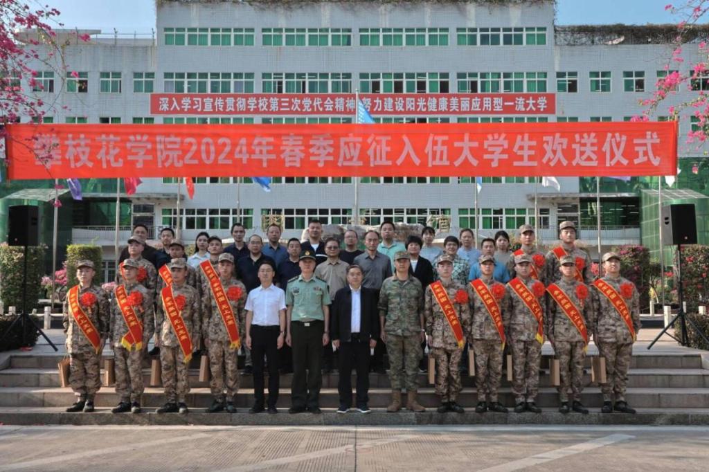 315日,我校举行应征入伍大学生欢送仪式。副校长王兵、攀枝花市东区人武部上校部长康贺卫、学校武装部负责人以及各二级学院分管学生工作领导、辅导员和教师代表、学生代表等参加。