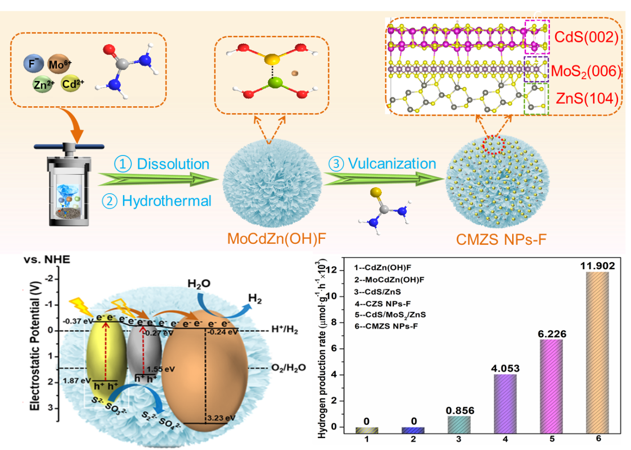 该成果针对煤、石油等能源短缺问题和环境污染问题,开发清洁可再生能源氢能。利用基于光生载流子转移的形态工程和通道构建技术设计合成了高效产氢光催化剂CMZSNPs-FZn(OH)F多功能平台限制了CdS/ZnSNPs的生长,提供了加速载流子界面转移的F-离子。同时,MoS2加速了光生电荷的快速捕获和转移使CMZSNPs-F的产氢速率达到11902μmol·g-1·h-1,是CdS/ZnS13.9倍。通过实验研究和密度泛函数理论计算结果得到,CMZSNPs-F的活性位点数量较多,e–h+复合效率较低,光生电荷转移效率较高,促使产氢速率大大提高。该成果在四川省科技计划项目、油气田应用化学四川省重点实验室、四川省高等学校绿色化学重点实验室开放项目、攀枝花市科技局项目资助下完成。