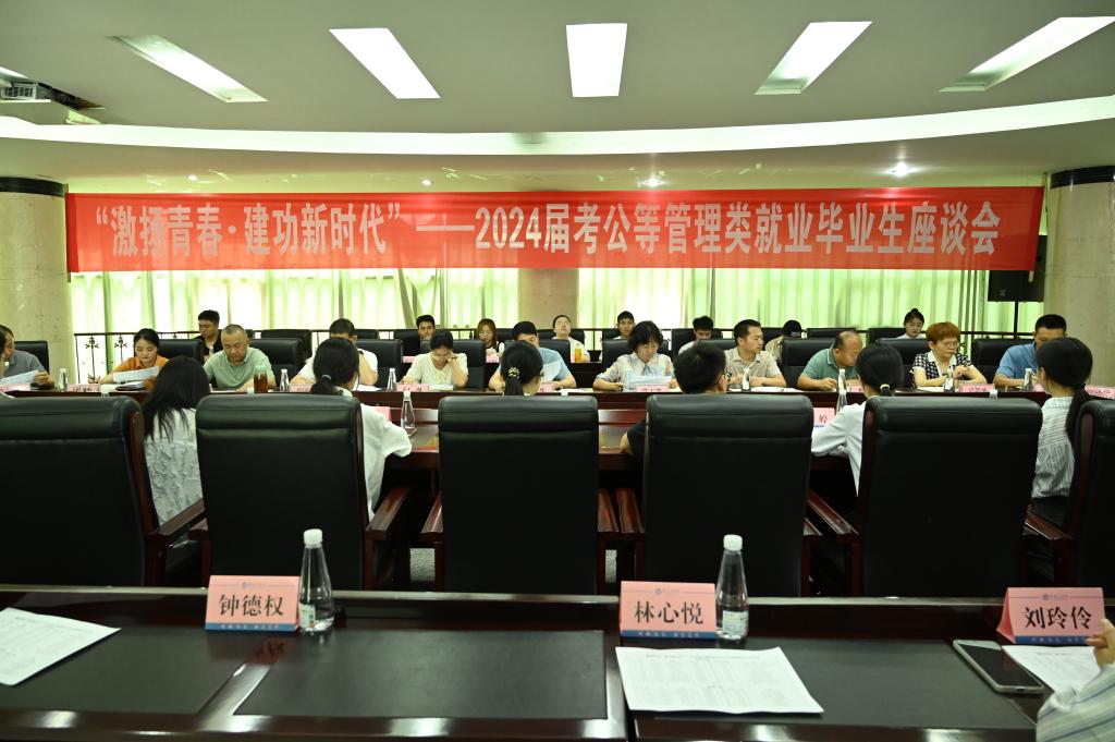 “激扬青春·建功新时代”毕业生座谈会上,毕业生代表分享了自己参加公考、选调生、西部计划等项目的历程,从明确备考目标与方向、综合能力提升、创新思维与实践能力培养、公考信息服务、考公学生事迹宣传、食堂饮食安全保障等方面提出了针对性意见和建议。