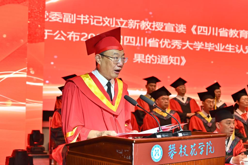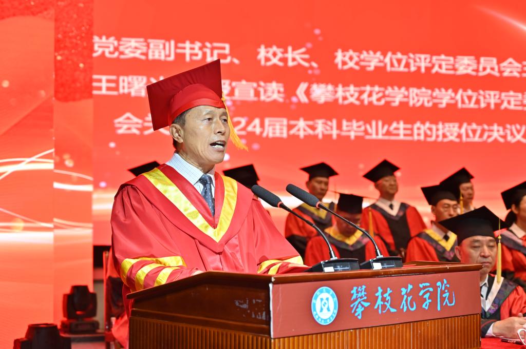 典礼上,党委副书记、校长王曙光宣读《攀枝花学院学位评定委员会关于2024届本科毕业生的授位决议》,党委副书记刘立新宣读《四川省教育厅关于公布2024届四川省优秀大学毕业生认定结果的通知》副校长王兵宣读《关于聘任龚鳗等116名同学担任攀枝花学院2024届毕业生校友联络员的决定》。