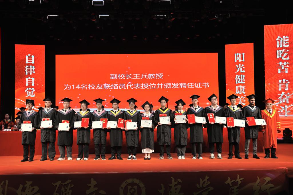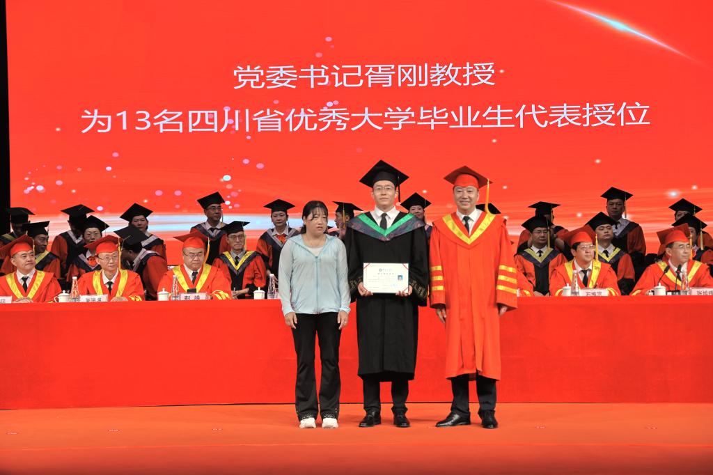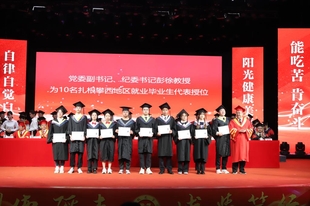 在毕业生授位环节,胥刚为四川省优秀大学毕业生代表13人授位,王曙光为学习标兵代表13人授位,彭徐为扎根攀枝花地区就业毕业生代表10人授位,刘立新、朱波强、石维富、王兵、朱云生分别为“青马班”毕业生代表、方毅•红班毕业生代表、校园达人毕业生代表、校友联络员代表、寝室集体考取研究生毕业生代表授位,附属医院党委书记田巨龙、中心医院党委书记徐文豪为毕业的巴基斯坦留学生18人授位。一线教师代表张士举为13名优秀毕业(论文)设计毕业生代表授位。授位导师依次为参加现场授位的毕业生授位。