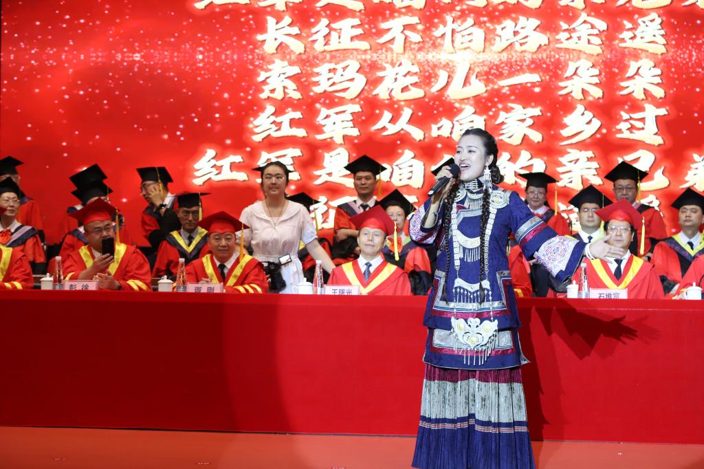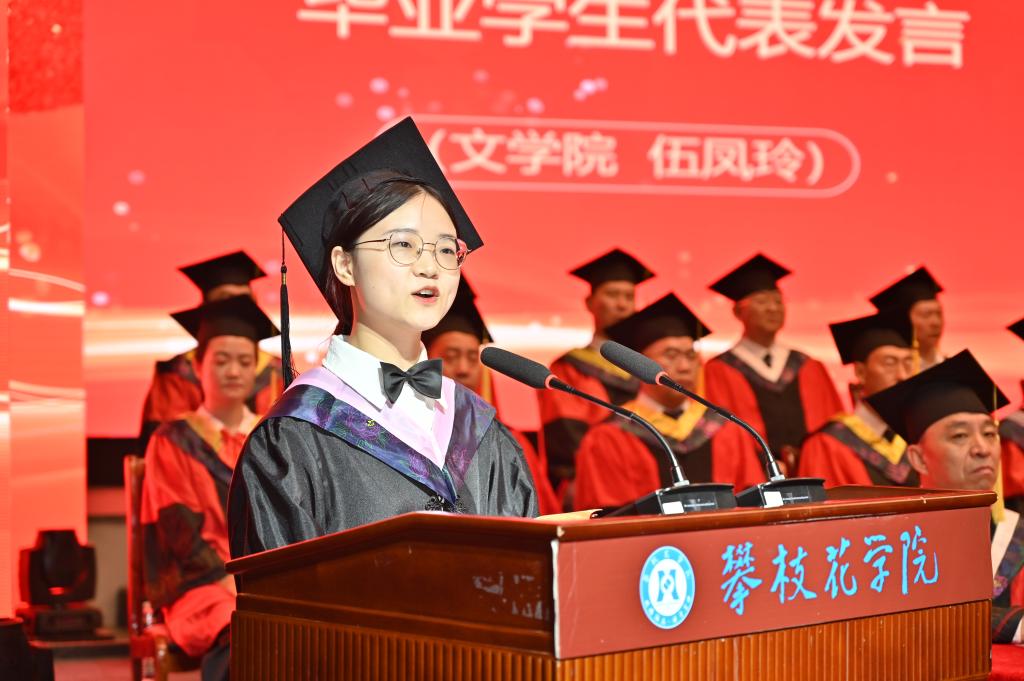 文学院毕业生伍凤玲在发言中向母校、老师、父母、亲友表达最真挚的感谢。她表示毕业学子将带着母校的期望和祝福,带着老师们的教诲和嘱托,走向更广阔的天地,用自己的智慧和汗水书写属于自己的人生篇章。