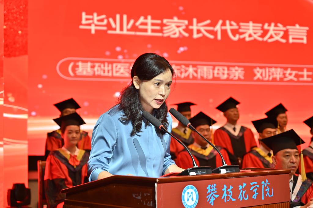 基础医学院陈沐雨母亲刘萍女士代表全体毕业生家长感谢学校为孩子们提供优质的学习资源和教育平台,感谢老师们四年来的辛勤培育。她寄语全体毕业生要饮水思源、心怀感恩,志存高远、脚踏实地,用知识和技能回馈社会,用青春和智慧点亮梦想。