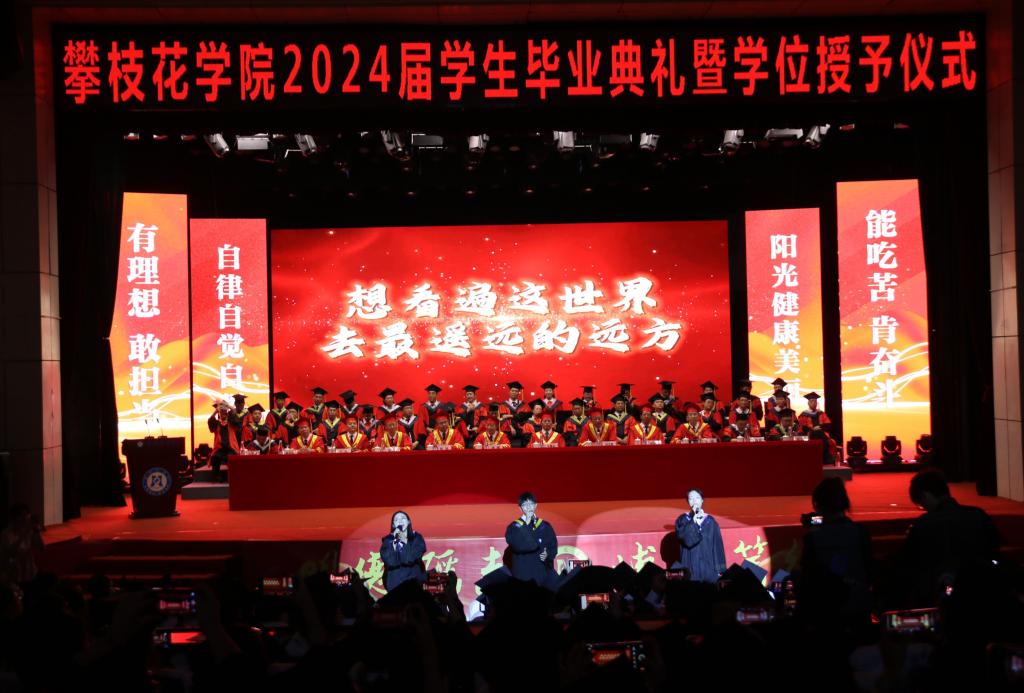 典礼上,党委书记胥刚作题为《阳光照亮前程,美丽相伴人生》毕业致辞。他对顺利完成学业、继续读研深造、在创新创业大赛中取得优异成绩、校园之星和校园达人、方毅·红班、服务西部、扎根基层、扎根攀枝花的同学们和18名巴基斯坦留学生表示热烈祝贺。感谢广大学子把阳光健康美丽注入攀大,把人生最美好的青春留在攀大,希望留学生们将所学所得奉献家乡,推进文化交流、共缔中巴友谊。