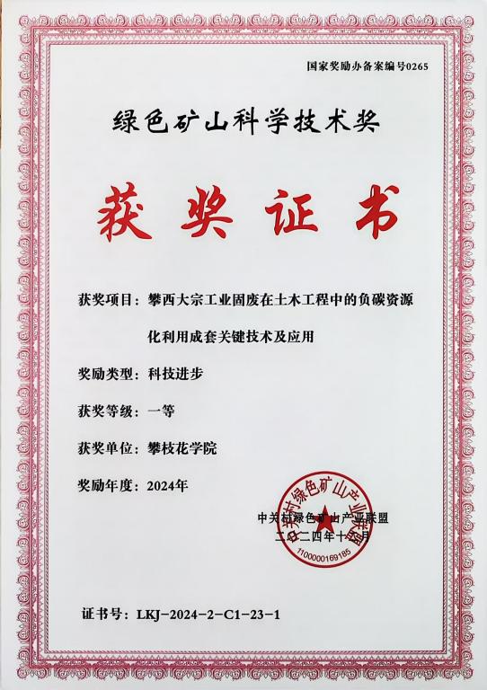 110-12,第二届中国绿色矿山国际年会2024年度绿色矿山科学技术奖颁奖大会在北京召开。由我校土建学院汪杰博士牵头,攀枝花学院为第一完成单位,与四川轻化工大学、攀枝花市润泽建材有限公司联合完成的《攀西大宗工业固废在土木工程中的负碳资源化利用成套关键技术及应用》荣获绿色矿山科技进步一等奖,由汪杰博士团队牵头以攀枝花学院为第一单位完成的项目还获得了2024年度绿色共享与循环利用贡献奖二等奖,汪杰博士被评为2024年度绿色矿山优秀科技工作者。这是学校持续推动有组织科研获得的重要成果,是学校重视本土人才持续培养取得显著成效。