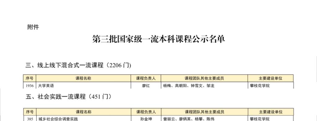 8月21日,教育部公示了第三批国家级一流本科课程认定结果,我校廖红教授主持的《大学英语》获批线上线下混合式一流课程,孙金坤教授主持的《城乡社会综合调查实践》获批社会实践一流课程。