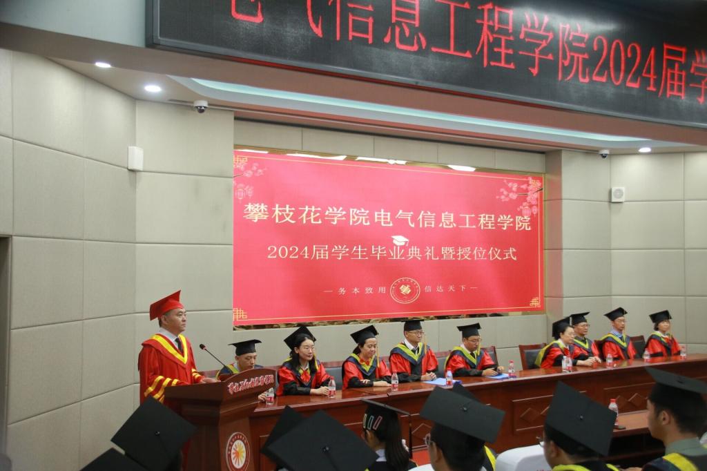 典礼上,副院长(主持工作)向国齐教授宣读《攀枝花学院学位评定委员会关于2024届本科毕业生的授位决议》,他充分肯定了毕业生们四年的努力和收获,期望同学们在今后的人生道路中能够坚持学习,提高自己人生的高度、宽度和厚度,志存高远,脚踏实地,在劈荆斩浪中开拓前进。