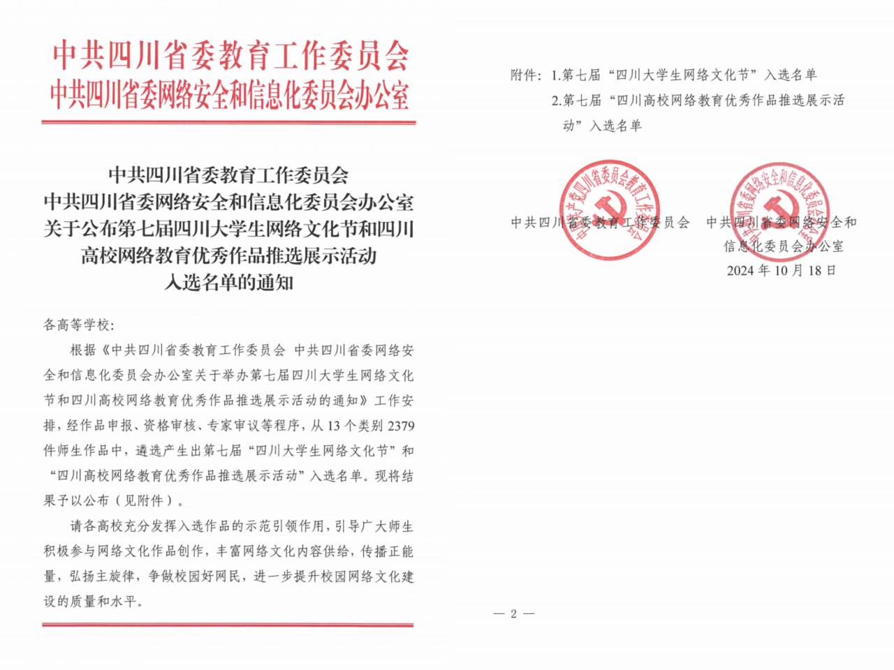近日,由中共四川省委教育工作委员会、中共四川省委网络安全和信息化委员会办公室主办的第七届四川大学生网络文化节和四川高校网络教育优秀作品推选展示活动遴选结果揭晓,我校师生创作的网络文化作品荣获二等奖1项,三等奖3项。