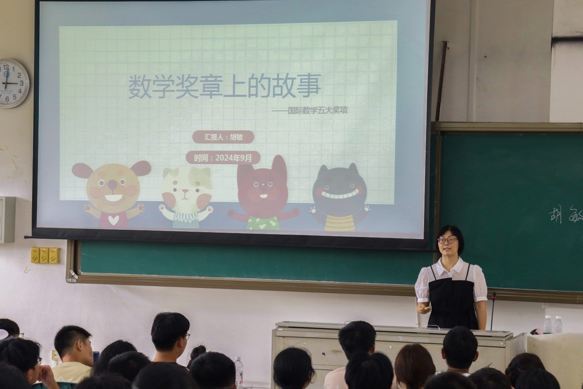 师德标兵胡敏老师以《数学奖章上的故事》为题,带领同学们领略了数学的奥秘,向同学们展示了国内外数学领域的杰出成就。她指出,高中数学主要侧重基础知识和解题技巧,而大学数学更注重理论深度和逻辑推理能力的培养。
