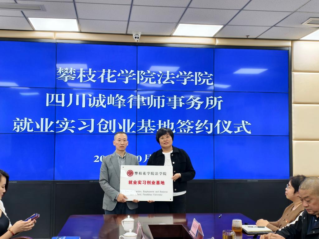 与会人员围绕法律服务实践、产教融合、高质量就业等方面进行了深入交流探讨,双方达成了初步合作意向。随后,张琳为四川诚峰律师事务所授牌“攀枝花学院法学院就业实习创业基地”,为蒋风云等律师颁发行业导师聘书,并与蒋风云共同签署了《法学本科生就业实习创业基地共建协议书》。